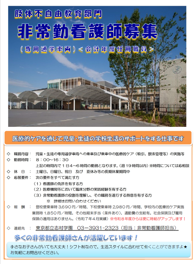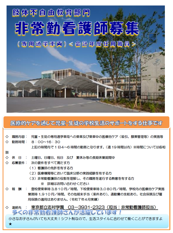 肢体不自由教育部門では、学校非常勤看護師を募集しています。